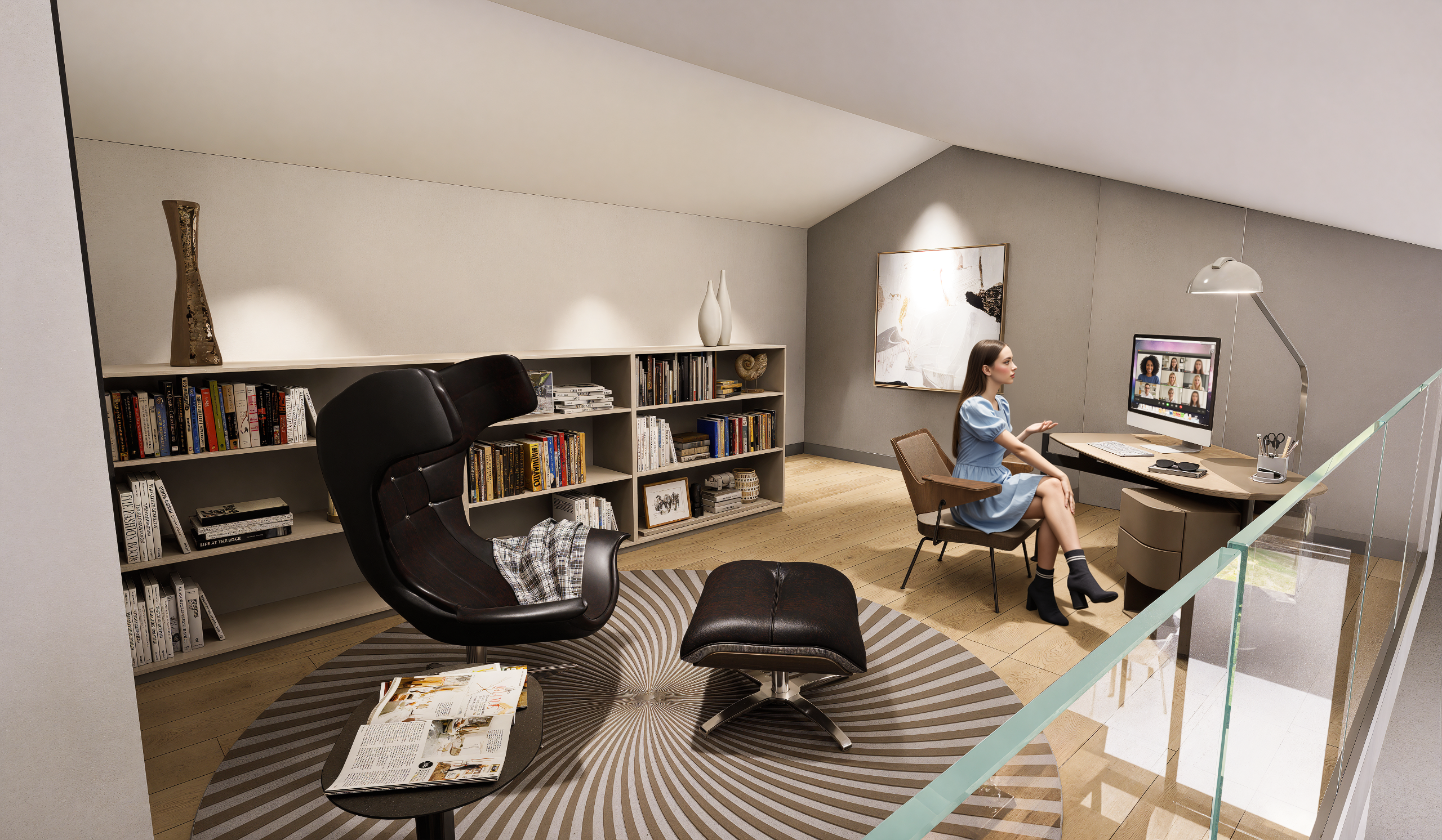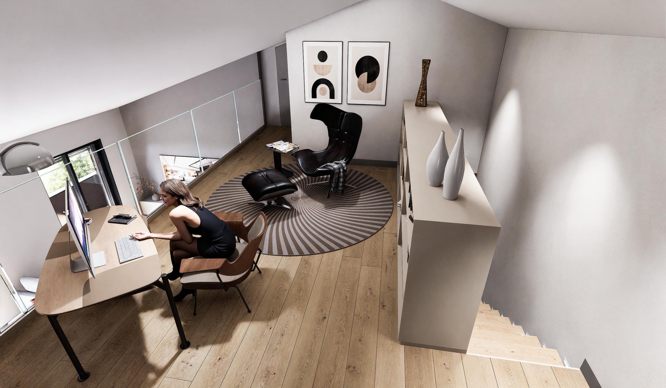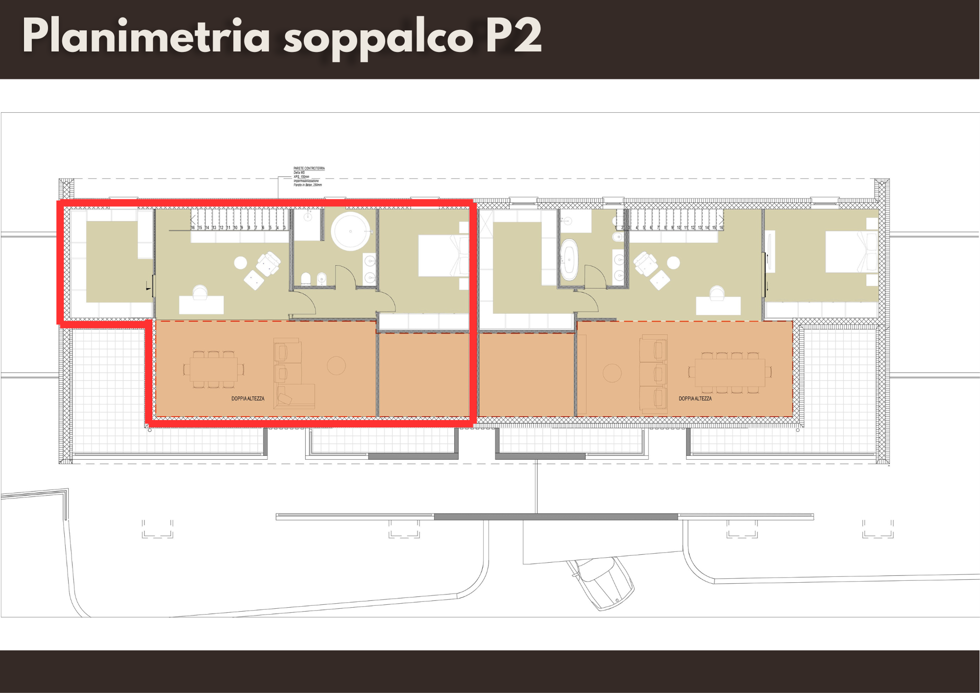 Una scala interna conduce al piano superiore, dove si apre un elegante soppalco con parapetto in vetro e splendida vista sul soggiorno sottostante. Questo spazio, luminoso e scenografico, ospita una comoda cabina armadio, una seconda ampia camera matrimoniale e un raffinato bagno dotato sia di doccia sia di vasca idromassaggio, pensato per offrire un'atmosfera di benessere e relax.