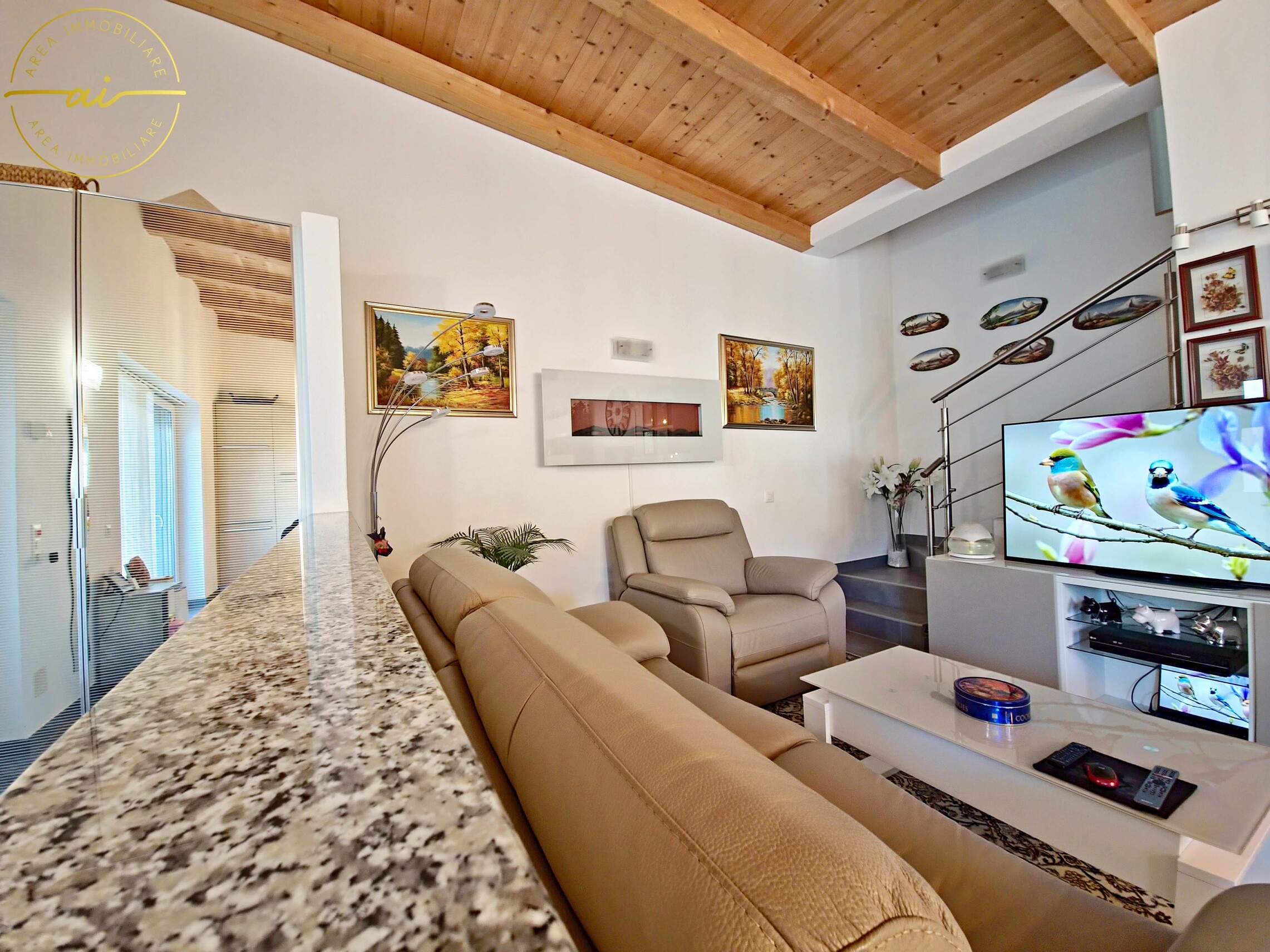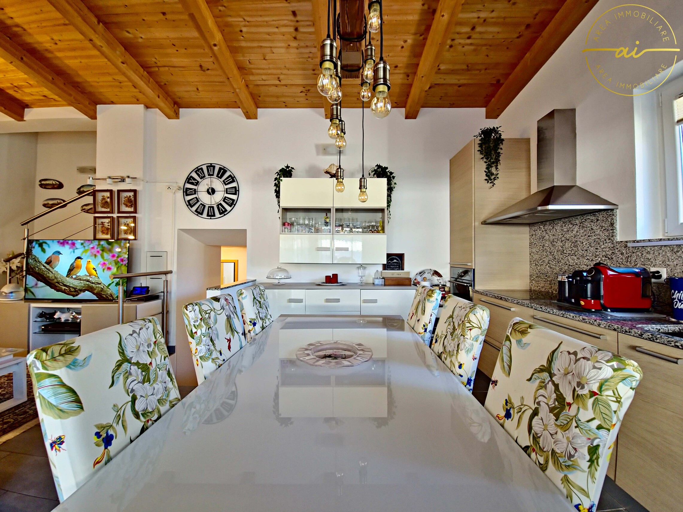 La zona giorno, caratterizzata da eleganti travi a vista, offre un accogliente angolo divani TV e una zona pranzo con cucina moderna a vista, completamente accessoriata con lavastoviglie, piano di lavoro in granito, frigo, congelatore e tutti i comfort di una casa moderna e funzionale.