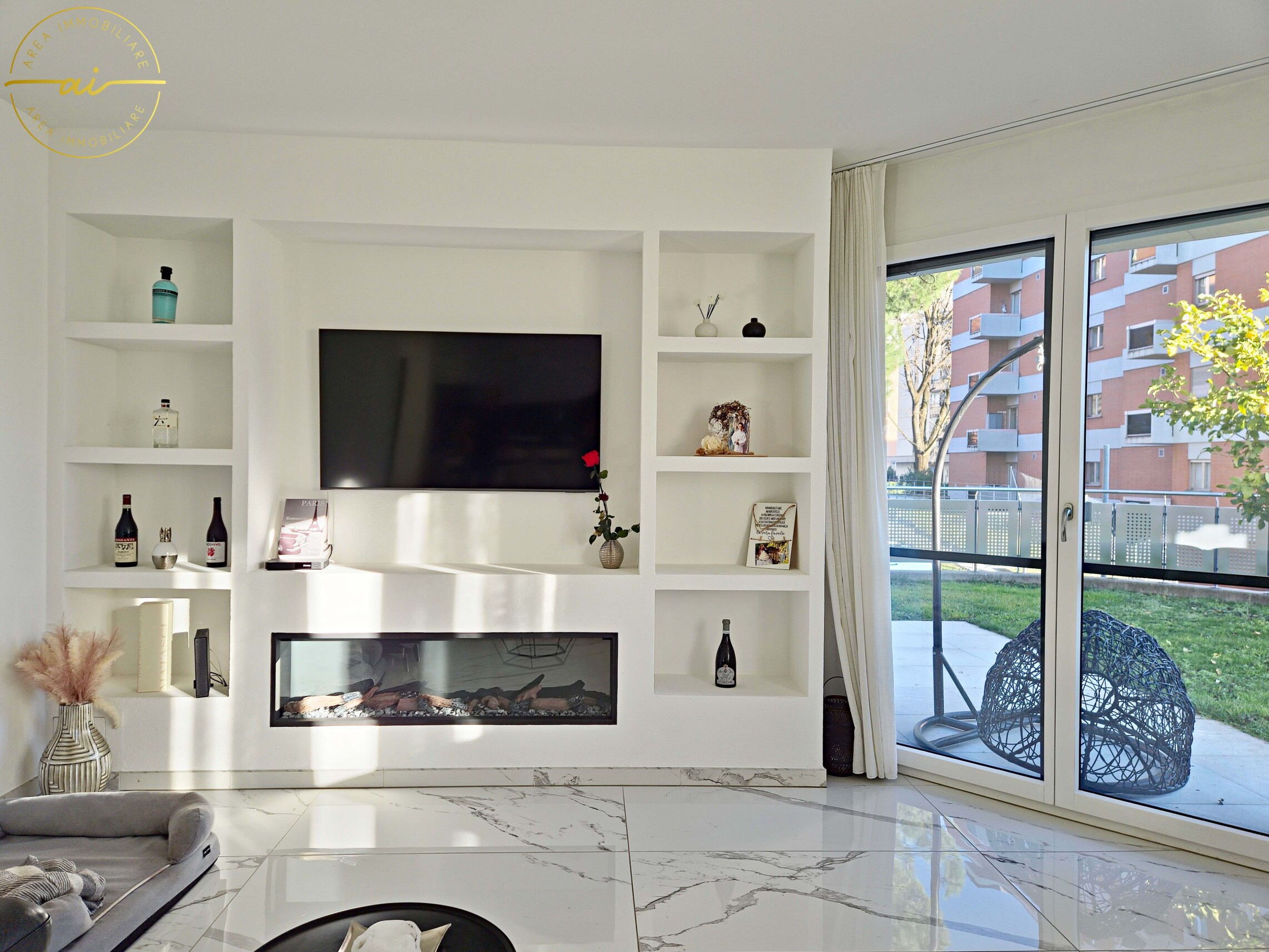 L'ingresso è dotato di armadi su misura e conduce all'ampia zona giorno, caratterizzata da un luminoso soggiorno con camino in bioetanolo ed una moderna cucina a vista, attrezzata con elettrodomestici di alto livello. Questa zona è valorizzata da ampie porte finestre che permettono l'accesso diretto al giardino privato, creando una piacevole continuità tra interno ed esterno.
