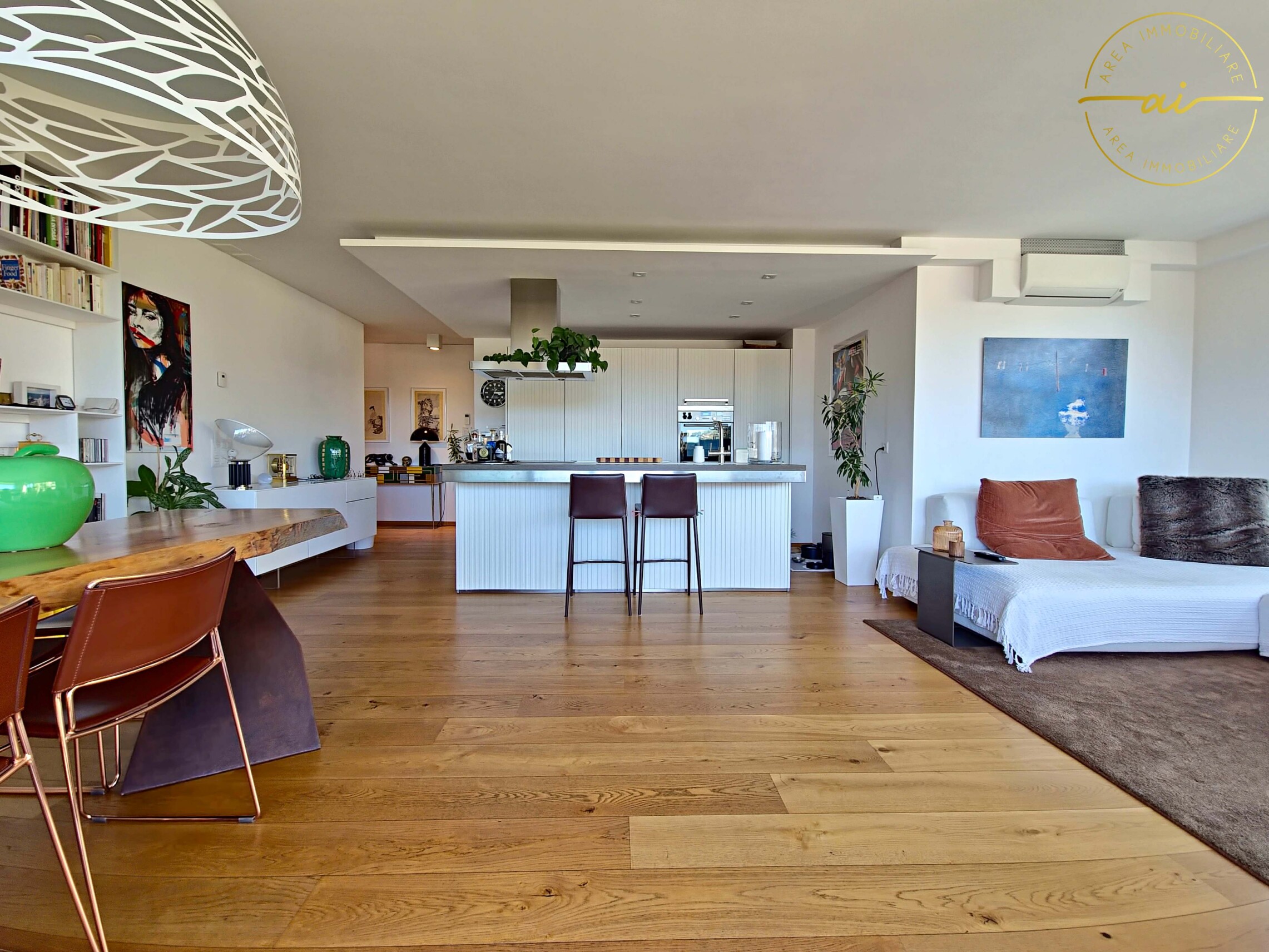 L'ingresso si apre su un corridoio funzionale che conduce all'ampia zona giorno con cucina a vista moderna ed isola centrale, perfettamente integrata con l'ambiente living. Le grandi vetrate garantiscono un'ottima luminosità e consentono l'accesso alla terrazza coperta di 14 mq, impreziosita da una ringhiera in vetro e da una splendida vista panoramica.